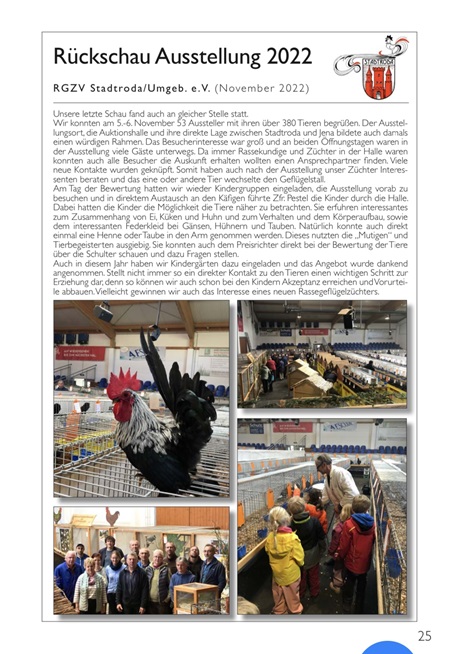Es wurden von 55 Züchtern Geflügel aller Rassegruppen ausgestellt und die Besucher konnten sich auf 400 Tiere: Gänse, Ente, Puten, Hühner /Zwerg Hühner, verschiedenste Rassetauben, Wachteln und zur Präsentation: Flugtauben, Bodenpurzler und Finken freuen. Einige Restkataloge sind noch vorhanden und könne gerne direkt unter info@rassegefluegel.org nachbestellt werden.